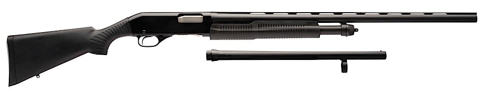 The Stevens 320 Field Grade is a family of pump-action 12- and 20-gauge shotguns. Carbon steel barrels are available in a number of different lengths and a ventilated rib is adorned with a fiber-optic front sight. Users can select their shot pattern via interchangeable chokes and they can attach slings to swivel studs at their leisure. The 320 Field Grades synthetic furniture is textured at the grip and forend.