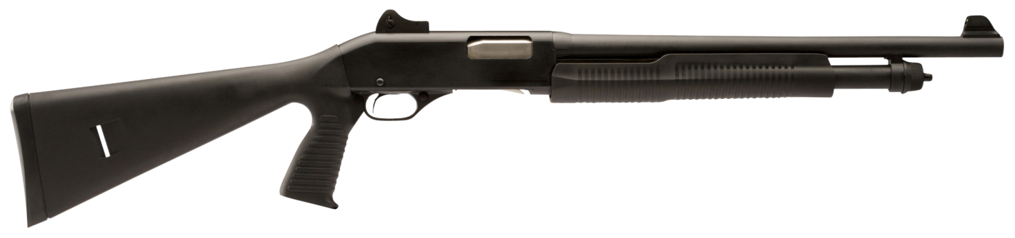 This Stevens 320 is a pump-action 12-gauge shotgun. An 18.5 barrel is adorned with a bead front sight. Texturing on the polymer pistol grip and forend provide users a secure grasp on this basic defensive shotgun. Dual slide-bars prevent twisting and ensure users can rely on the Stevens 320 to defend their home.