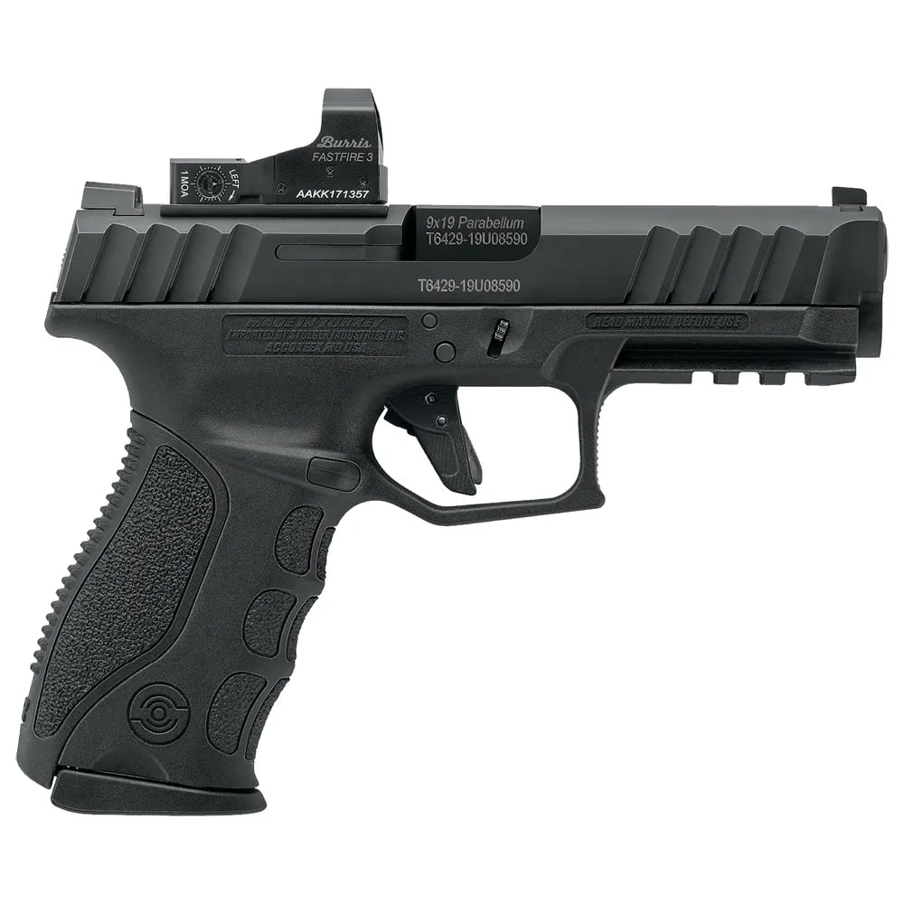 The STR-9 Optics Package is an ideal choice for personal or home defense. The STR-9 itself features a highly ergonomic grip design with stippled texturing in in strategic areas and aggressive rear checkering on the back strap for superior control over the weapon even in adverse conditions. To promote positive manipulations when chambering a round, clearing the weapon, or preforming press-checks, the STR-9’s slide features deeply cut cocking serrations in the front and rear areas, and a tactile loaded-chamber indicator on the top of the receiver allows the operator to immediately tell if a round is chambered. The STR-9 Optics Package is topped off with an included Burris Fast Fire III Micro Red Dot Sight. This compact optic features an highly visible reticle for rapid target acquisition and engagement, and index-matched Hi-Lume multicoatings enhances low-light performance and eliminates glare. In addition, the Fast Fire III electronics and chassis are built tough, allowing them to easily stand up to the rigors of self-defense and competition applications.