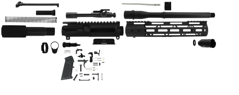 TacFire’s AR-300 Unassembled pistol build kit includes a black parkerized barrel with a 1:8 twist rate, 5/8×24 spiral fluted Krink style forwarder muzzle device; a Slim M-Lok free-float handguard; 7075-T6 billet aluminum stripped upper; 5.56 bolt carrier group; Mil-Spec charging handle, dust cover, forward assist, heavy buffer, pistol length gas tube, low profile gas block; complete pistol buffer tube, A2 pistol grip, and lower parts kits all made in the USA. This model has a 10.5″ barrel and 10″ handguard.