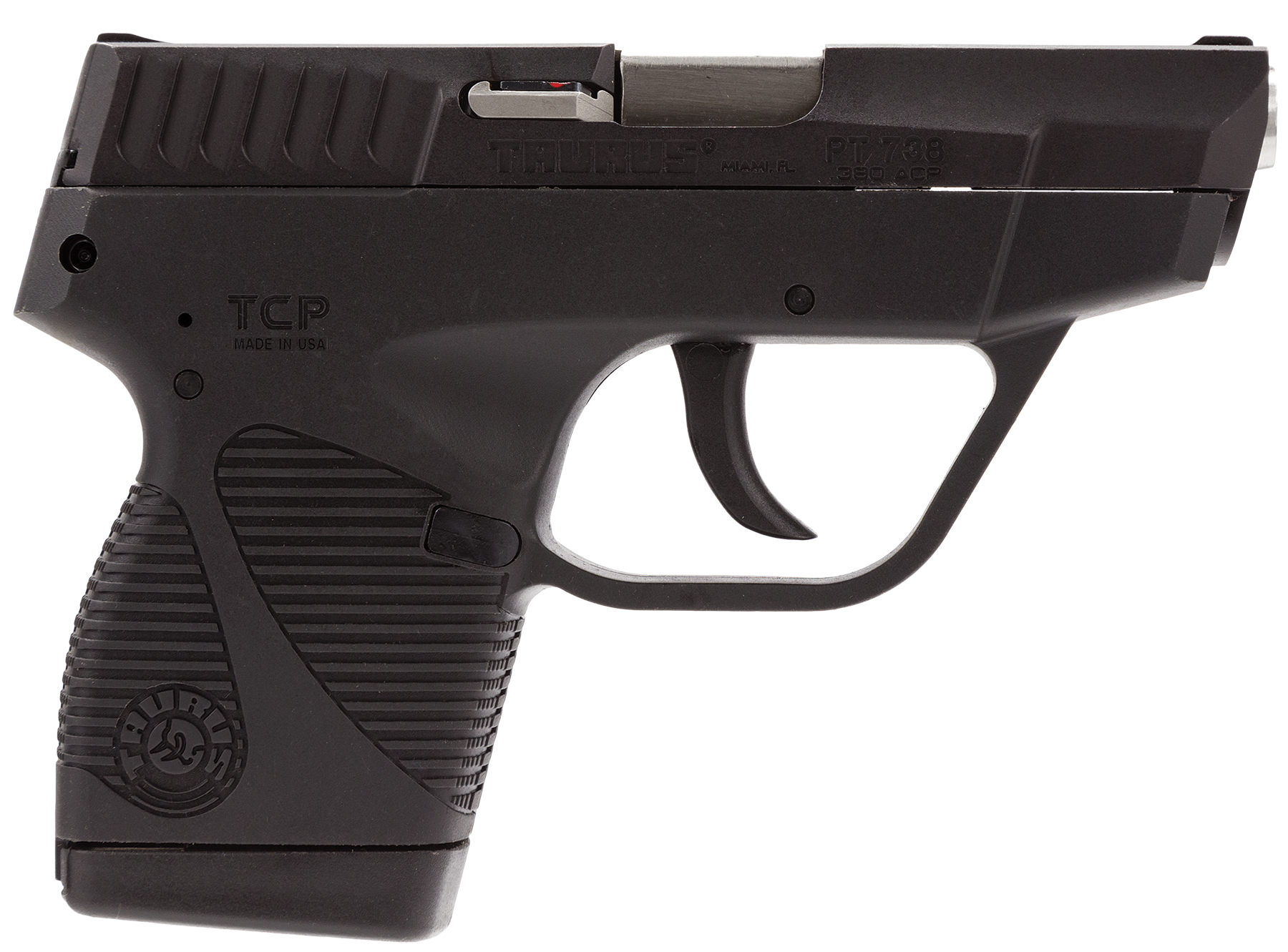 Short for “Taurus Compact Pistol,” the Taurus TCP is the lightest pistol ever made by the company. Well-suited for concealed carry, this semi-automatic handgun is chambered in 380 ACP and made with a lightweight, durable polymer frame. The integral grips with lined front and backstraps ensure a steady grasp through each round fired, while the low-profile fixed sights aid in target acquisition. Other features of this American-made pistol include a smooth trigger, generously-sized trigger guard, and loaded chamber indicator for added safety.