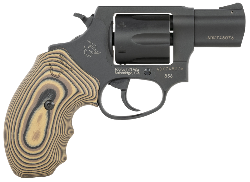 The Taurus 856 is ideal on-body or off-body carry, and home defense usage. It features soft rubber grips, while the double/single action increases speed and accuracy for follow-up shots. The Model 856 also has serrated ramp front/fixed rear sights and a transfer bar safety.This Taurus model has a 2″ carbon steel barrel and matte black metal finish with brown VZ Grips