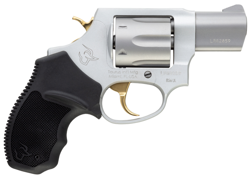 The Taurus 856 Ultra Lite is a lightweight and easily concealable 6-shot revolver with a small frame and 2” barrel. Chambered for .38 Special cartridges, this compact, concealed carry pistol is assembled with a lightweight aluminum frame, the Ultralite model has an overall weight of 15.7 ounces. The 856 Ultra-Lite features soft rubber grips and a double/single action for fast and accurate follow-up shots. Designed for concealed carry, this revolver provides accuracy in a lightweight and comfortable package. This Taurus model has a matte stainless finish with gold accents.