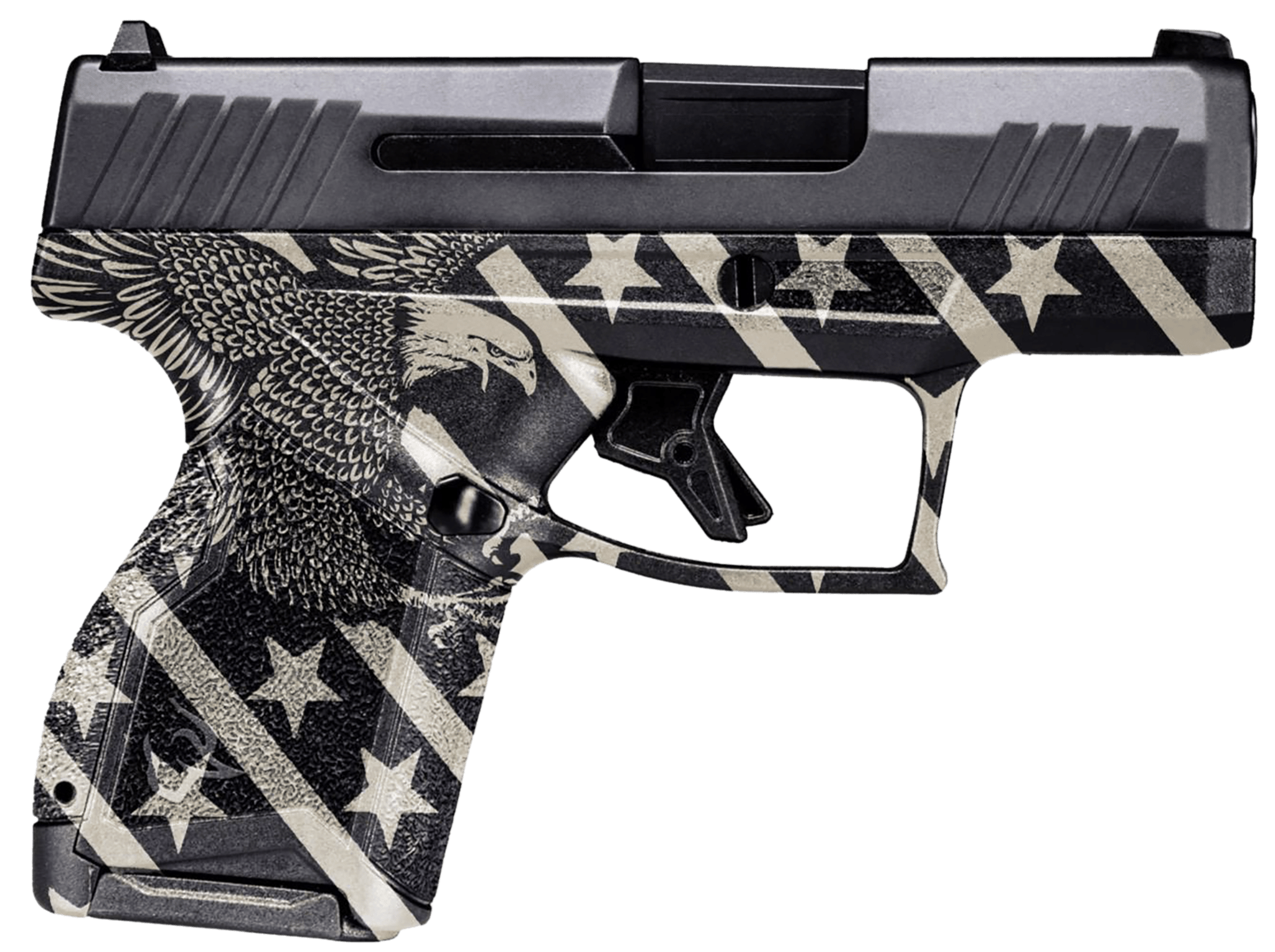 Taurus GX4 Micro-Compact Frame 9mm Luger 10+1 3.06″ Satin Black DLC Stainless Steel Barrel, Black Gas Nitride Serrated Alloy Steel Slide, B&W Eagle/Flag Polymer Frame & Grip, 2 Mags, Right Hand