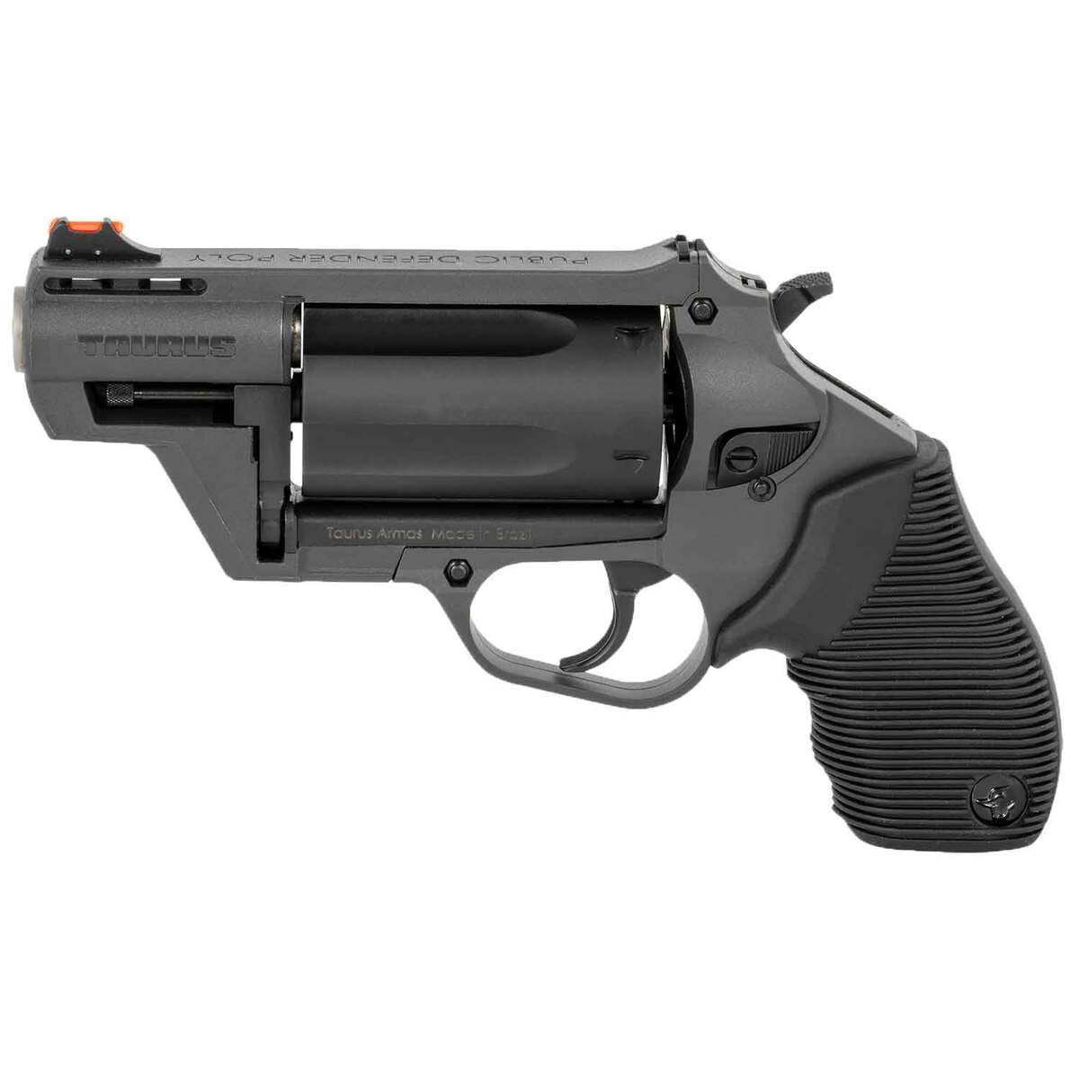 Taurus Judge Public Defender 45 (Long) Colt/410 Gauge 2.5in Gray Polymer Revolver – 5 Rounds. The Judge Public Defender by Taurus delivers the same devastating power as the Judge in a scaled-down size that’s easy to carry. The Public Defender features a reduced profile hammer, an extended ejector rod, a ribber grip, the Taurus Security System, a transfer bar, and a red fiber optic fixed front sight.