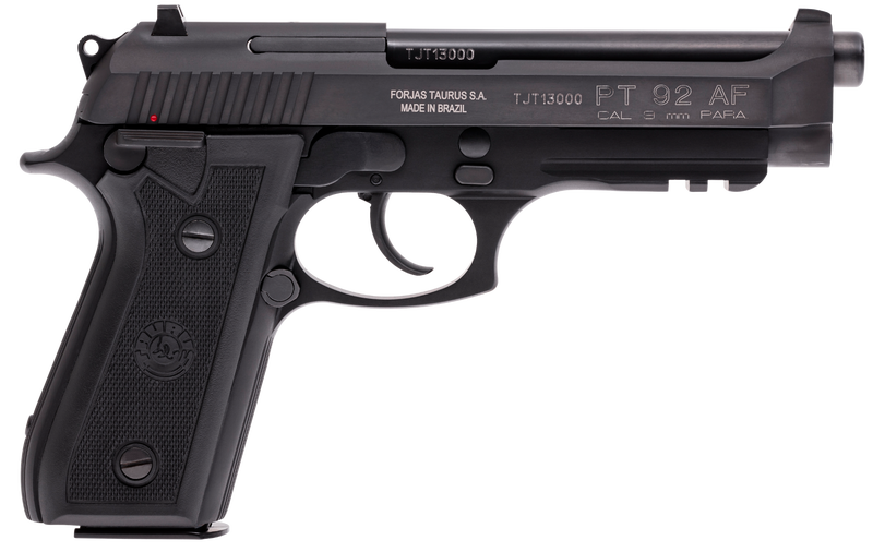 The Taurus PT-92 pistol was created to improve on the Beretta design. The specially-designed drop hammer-forged ordnance-grade alloy frame won’t crack or allow the slide to come off, and a three-position frame-mounted ambidextrous safety allows for a classic SA “cocked-and-locked” mode and also functions as a DA decocking lever. The Taurus PT-92 also features a loaded chamber indicator, the Taurus Security System, a Picatinny rail, and fixed 3-Dot sights.