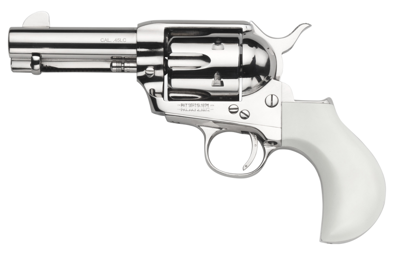 The Taylors & Co 1873 Single Action Flattop Birdshead Ivory model is the perfect “barbeque gun” to show off! It combines the performance of a full size revolver with a compact barrel length. This model features a steel new model frame, classic nickel plated finish, and a one-piece polymer ivory flattop birdshead grip.