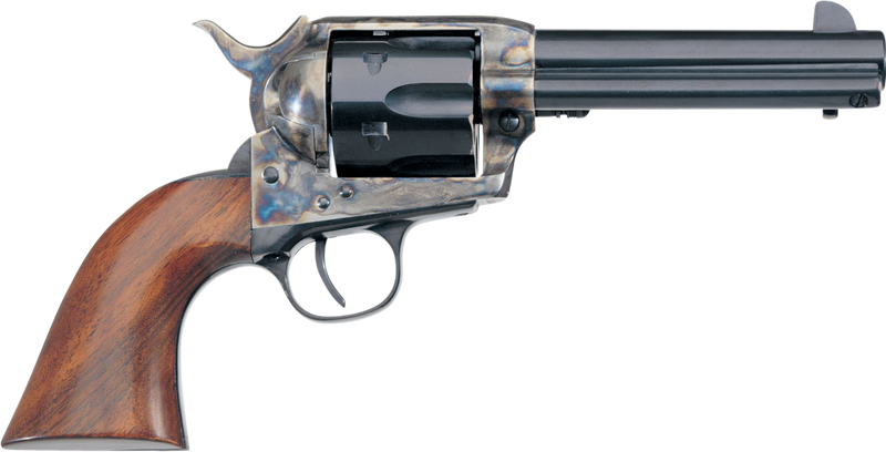 Taylors and Company has reproduced the Cattleman, New Model in .357 magnum with 4-3/4″ barrel. Manufacturing single action models using the highest standards available these are some of the finest reproduction 1873 Cattleman revolvers available. All 1873 Cattleman revolvers are forged for the strongest structure possible. This “Peacemaker” style revolver is blued with steel case hardened frame and a plunger to remove the cylinder pin. It weighs 2.27 lbs and has walnut grips and blade front sight.