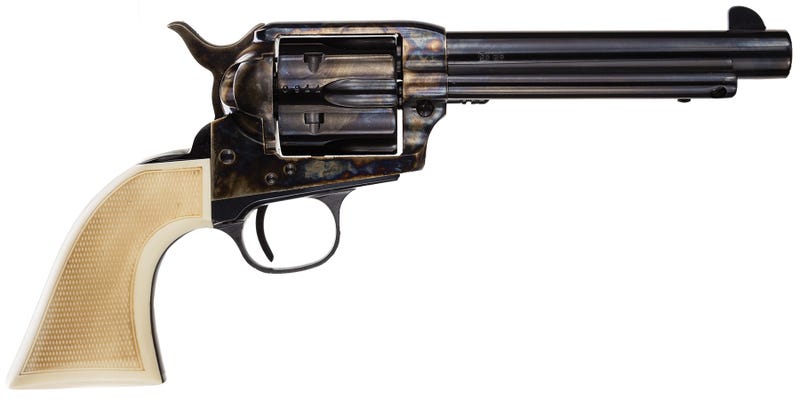 The Taylor & Co Marshal offers another custom grip option on the model forged frame cattleman. The Marshal grip is a one-piece polymer aged ivory grip with rich checkering.