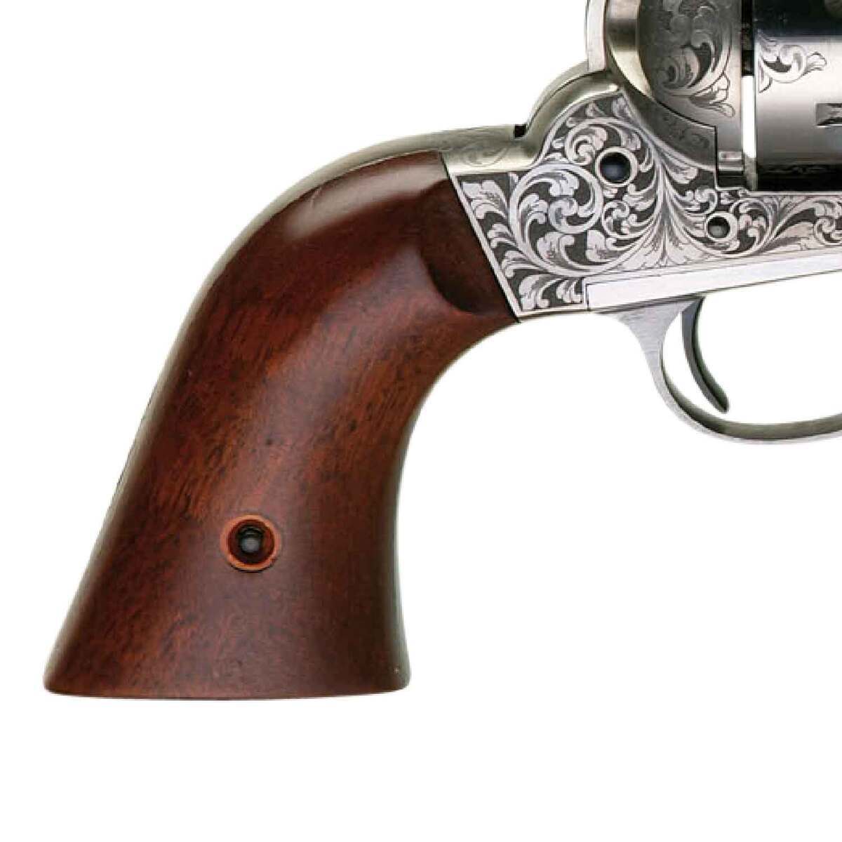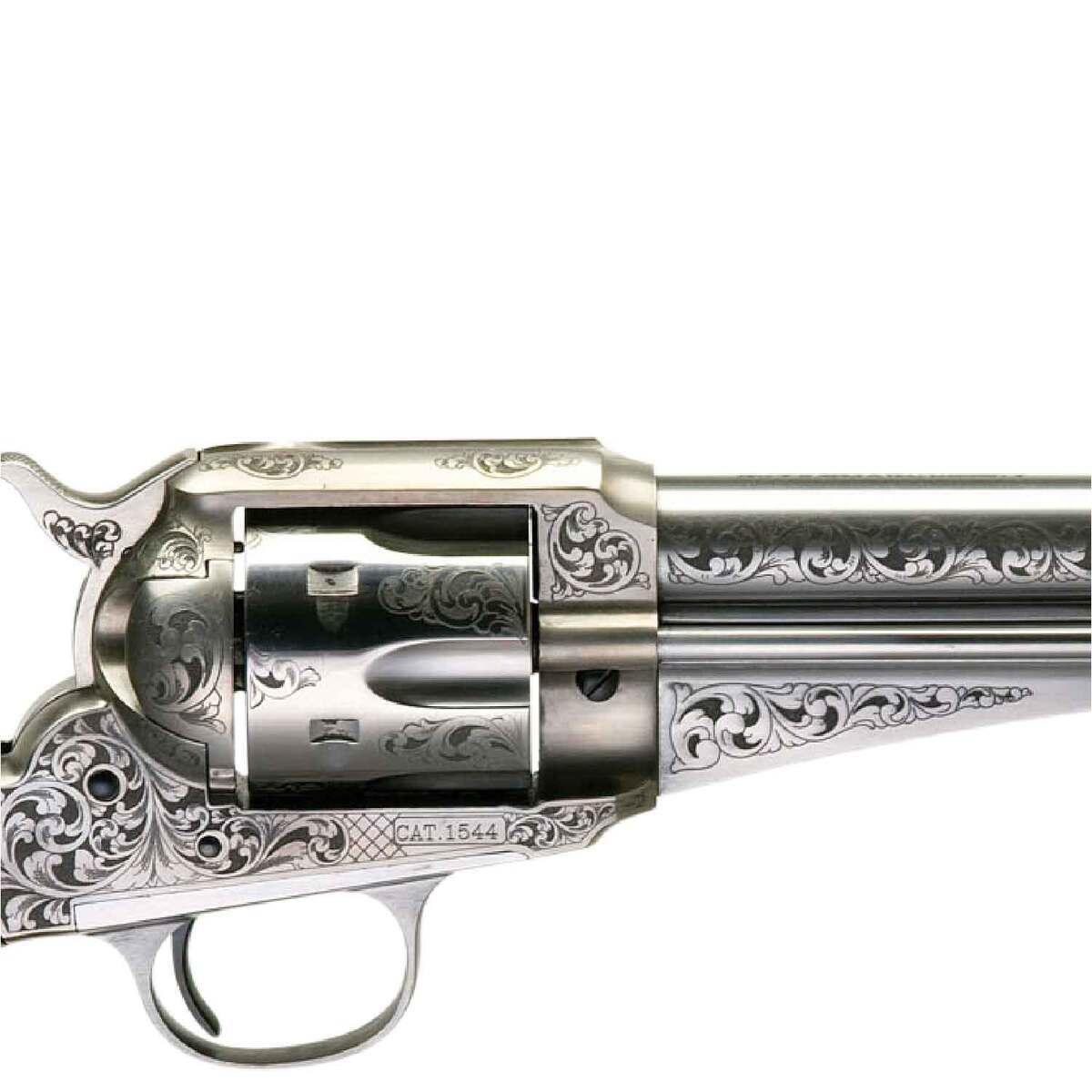 Taylors and Company 1875 Army Outlaw 357 Magnum 7.5in White Engraved Steel Revolver – 6 Rounds – The 1875 Army Outlaw Revolver is a faithful reproduction of the 1875 Remington single actions, which kept the solid frame and overall styling of Remington’s 1858 percussion models. Ordinary citizens and Wild West lawmen alike recognized the sturdy quality of the Remington revolvers. The infamous Frank James even carried one for most of his outlaw career. The reproduction is available in his favorite caliber, 45 colt, and features a steel backstrap and two-piece walnut grip.