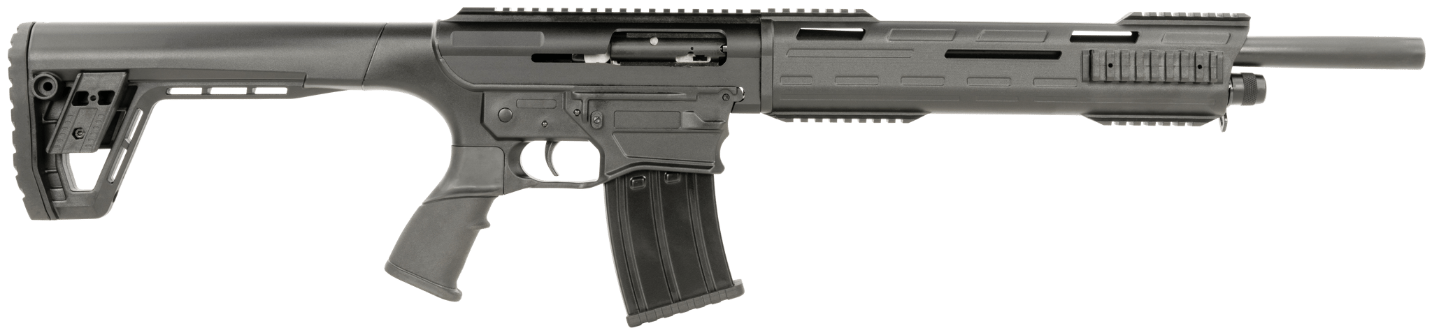 The Tokarev USA TAR 12P features polymer Flip-Up BUIS style sights; black chrome finish; 3″ chamber; integrated Picatinny Rails on the receiver and handguard give multiple mounting options for optics and other accessories. The TAR 12P uses the industry standard T-1919 shotgun magazine. Includes magazine, Benelli/Mobil Full, Modified and Improved Cylinder choke tubes and Choke wrench. Tokarev USA’s AR style semi-auto magazine fed shotgun is packed with great features for the everyday enthusiast. With a 18.5″ barrel length, one 5 round magazine, folding back up iron sights, choke kit with wrench this shotgun will function great and provide the quality you’d expect in a modern firearm.