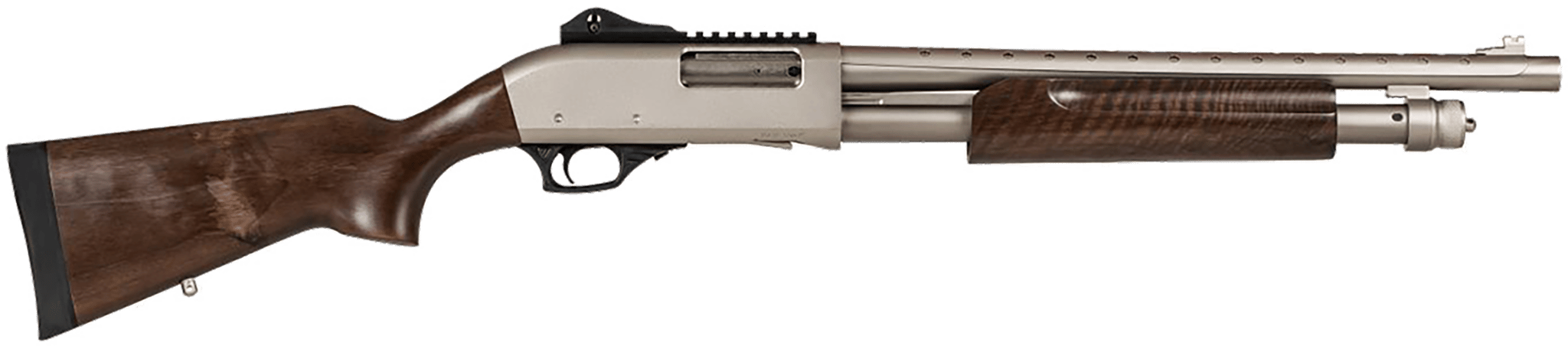 This classic looking 12 Gauge shotgun comes with a Turkish Walnut stock, Nickel Rec/Barrel, ghost ring/fiber optic sights, and a heat shield over the barrel.