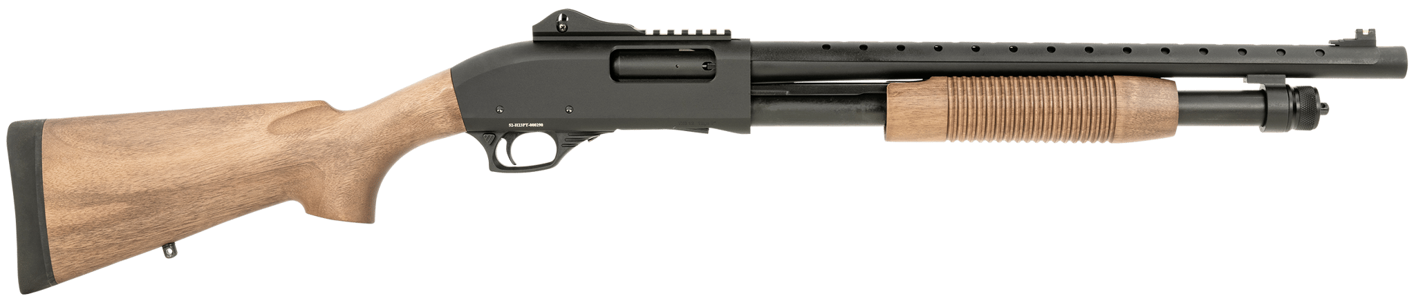 This classic looking 12 gauge shotgun comes with a Turkish Walnut stock, Black Rec/Barrel, ghost ring/fiber optic sights, and a heat shield over the barrel.