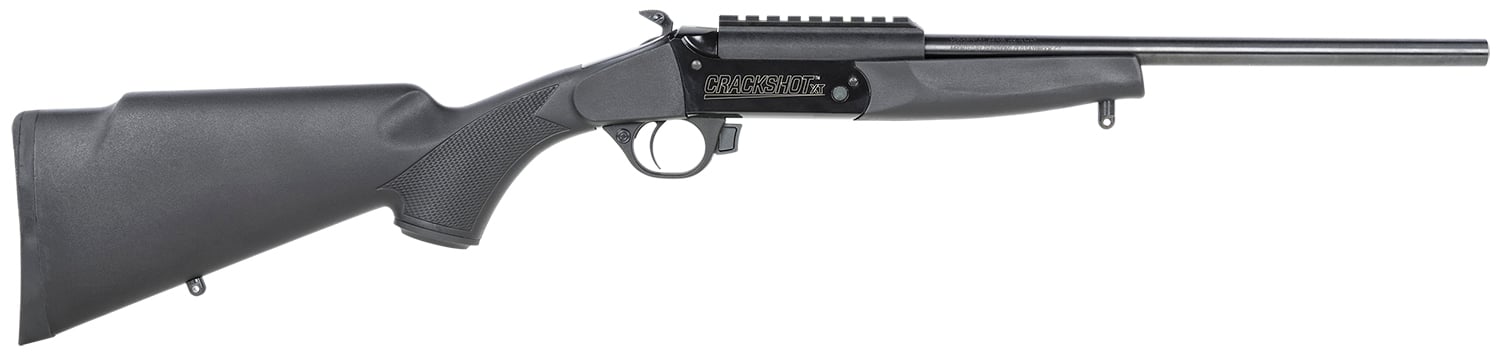 The Crackshot is a single shot, .22 caliber break action rifle. This gun has a 16.5″ barrel and weighs just over 4 pounds, making it lightweight and easy to carry. The Crackshot is an excellent truck gun or for beginners as well as for plinking and small game hunting. The built-in extractor makes removing a cartridge easy and the checkered stock provides a better grip. This rifle has a manual trigger block safety.