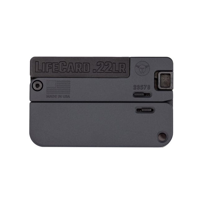 Back by popular demand, LifeCard 22LR. A folding, single-shot .22 caliber pistol that’s no bigger than a stack of credit cards. At .5 inches thin and weighing less than 7 ounces, the Trailerblazer LifeCard will be the last gun you’ll leave behind. This .22 caliber single action LifeCard pistol made in the USA by Trailblazer Firearms. Made of aluminum and steel with a corrosion resistant finish.