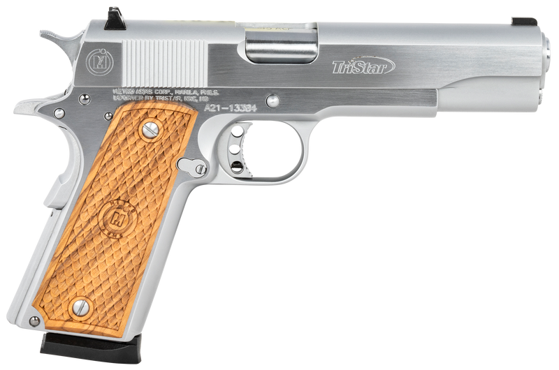 45 ACP semi-automatic with steel frame and steel slide. Single Action. Mil-Spec front & Rear sights. Custom hardwood grips with logo. 1 Magazine included, and packaged in hard plastic case. Also includes a gunlock, cleaning kit and owners manual.