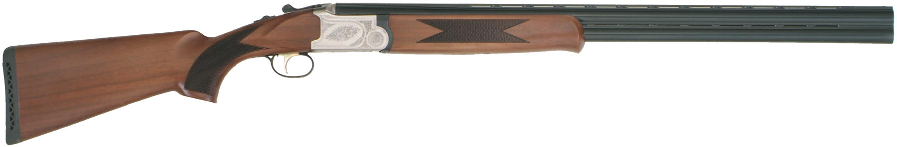 The TriStar Hunter EX is an over/under break action shotgun designed for hunting enthusiasts. It features a sleek design with a high gloss finish Turkish walnut stock and forearm. The acid etched receiver adds a touch of style to this firearm, while the chrome lined chambers and barrels ensure durability and reliable performance. The TriStar Hunter EX comes with a fiber optic sight for improved accuracy, a single selective trigger for ease of use, and a top tang barrel selector for convenience. The dual extractors and self-adjusting locking lugs enhance the overall functionality of this shotgun, making it a reliable choice for any hunting expedition. The rubber recoil pad adds comfort during long shooting sessions, and the gun comes with five interchangeable Beretta-style choke tubes to suit different shooting needs.