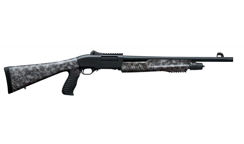 Features a lightweight and durable injection molded synthetic stock, dependable dual bar pump action, and swivel studs.