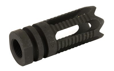Designed to work as a muzzle compensator while maintaining excellent flash hiding capabilities. 5 port design has no downward facing port which helps eliminate dust problems when shooting in the prone position. 1/2-28 threads. Includes crush washer.